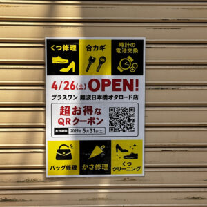 日本橋3丁目・オタロード東側に面したPC専門店「ドスパラ」が入居するビルの1階部分に、靴修理・合カギ複製・時計電池交換などの専門店「プラスワン」がオープン準備中。今月26日のオープンを予定しているとのこと。