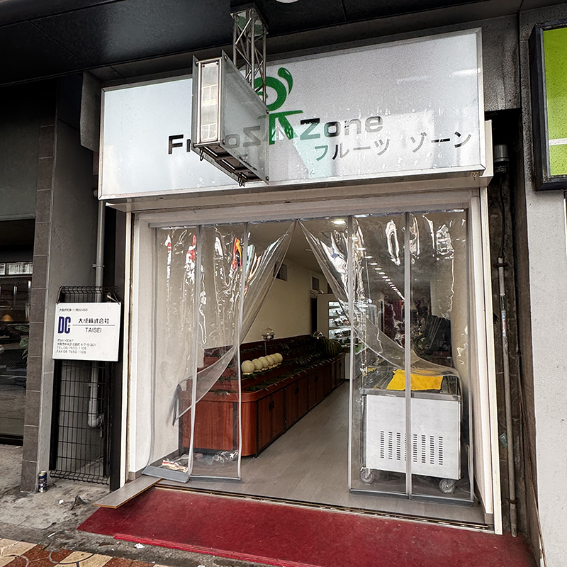 2023年初めより2年半以上空き店舗状態が続いていた、日本橋5丁目(堺筋アーケード西側、地下鉄恵美須町駅1B出口前)の元「えびす亭」跡で、最近になって新たな店舗の看板が上がっている。「フルーツゾーン」なる名前の果物専門店の模様。