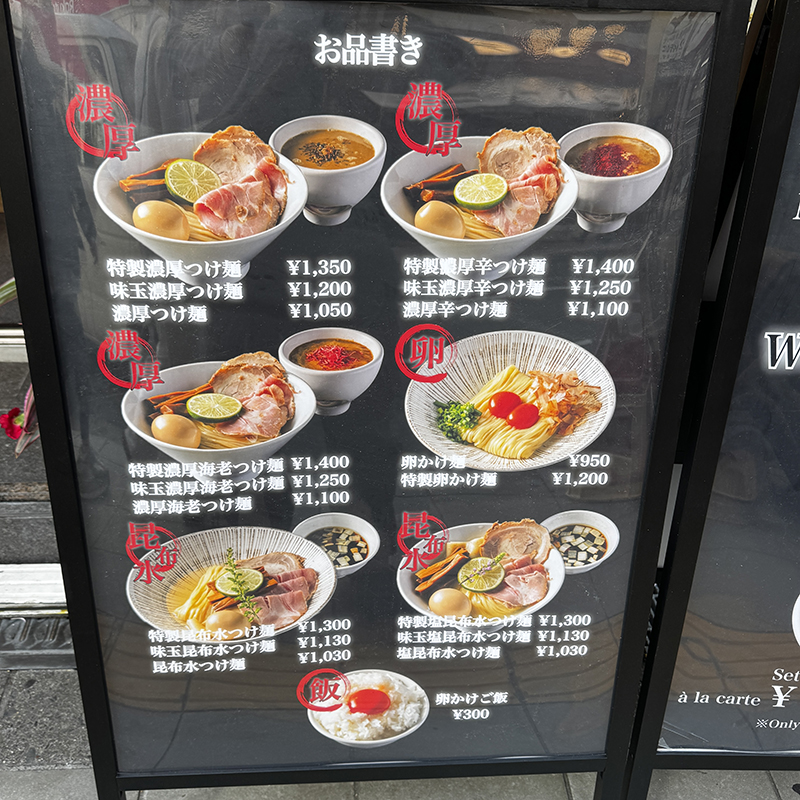 東京で2店舗(銀座・築地)を展開するラーメン店「銀座らぁ麺 しら石」の関西初進出となる店舗で、つけ麺に絞り込んだ新業態での出店となる。看板となる「濃厚つけ麺」(1,050円~)を中心に、昆布水つけ麺や卵かけ麺なども提供する。