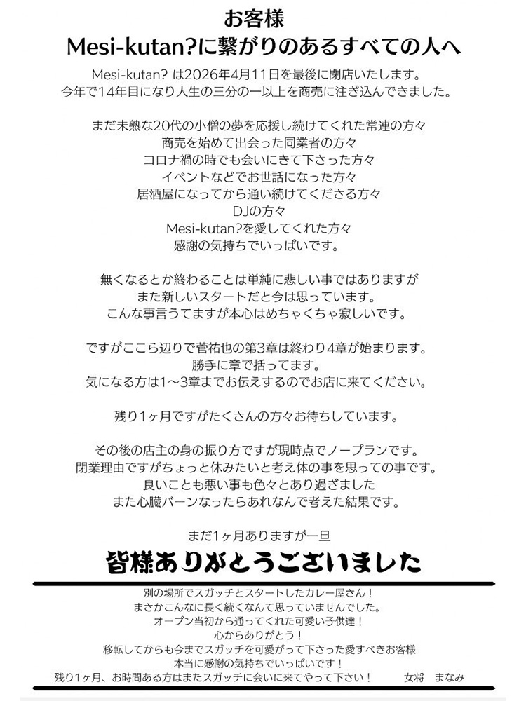 閉店の理由は、店主の体調面を考えたものとしている。